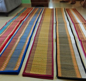 Reeds are harvested in season, dried, and sometimes dyed with natural colours. Weavers work on simple handlooms or frame looms, often at home. The weave is tight and even, creating a flat, durable surface. Larger mats can take days to complete. No machines are used — the rhythm is entirely human. You can read more in our story Madurkathi Weaving: Complete Process.